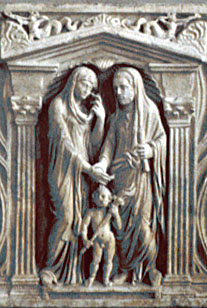One of the most famous styles was worn by women during the period of the Flavian emperors (Vespasian to Hadrian, 69-138 CE); this is the style that Juvenal mocks when he describes the woman who appears tall from the front but quite the opposite from the back (on this sarcophagus a woman with a Flavian hairstyle proudly displays the bust of an important male in her family; note her stola as well). Numerous slaves skilled in the arts of hairdressing and cosmetics were needed for these elaborate hairdos, as were hairpins (shown here with a beautifully carved ivory box in which to store them), wigs, and hair swatches. This hairpin made of bone is topped by the carved head of a woman with an elaborate hairstyle, while this one bears an inscription and originally showed the heads of a couple (the woman's head has broken off). Women also wore hairnets made of finely woven gold wires; this gold hairnet from Rome mirrors the hairnet shown on this Pompeian fresco portrait of a girl (often mistakenly labelled Sappho). Women also had many creams, cosmetics, and perfumes; this cosmetic box belonging to a woman in Pompeii was made of bronze and beautifully carved bone (wood portions have been restored). Cosmetics and hairstyling required mirrors, which were made of highly polished bronze or silver in rectangular or round shapes. The most elaborate had handles and relief carvings on the back, like this silver mirror depicting the myth of Phrixus riding the ram with the golden fleece.