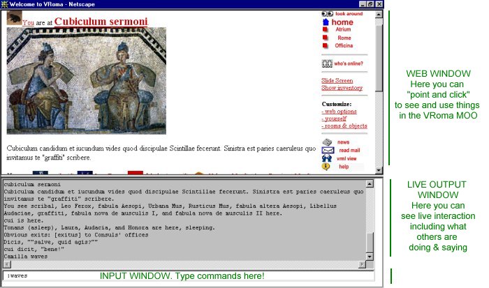 Please look at the image below in order to familiarize yourself with the interface and to know what to expect from each of the windows. Note especially the location of the INPUT WINDOW at the bottom -- this is where you should put your cursor before typing! (e.g. if you are chatting with someone live) |