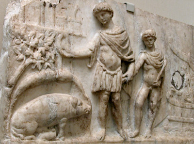depicts Aeneas and Ascanius finding the white sow with thirty piglets, the omen which marks the location of Alba Longa.