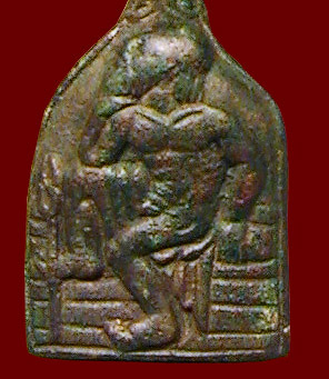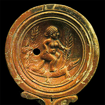 A naked female with a melon hairdo sits astride a large human phallus on the back of a crocodile; she holds a palm branch in her hand. Though made about a century after Cleopatra's defeat and death, the lamp seems intended to caricature the Egyptian queen as a female who used her sexuality as a means to power.