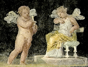 Aphrodite, accompanied by two Erotes, is seated next to her lover Anchises, who is depicted