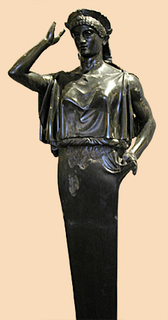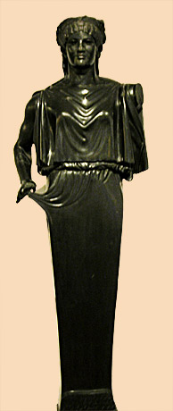 The god Tinia (Zeus, Jupiter) stands in the center holding in his right hand a scepter topped