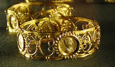 gold bracelets decorated with 4 imperial coins; Roman, early fourth century CE