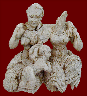 A temple is shown in the background, so the standing woman may be a priestess, and the man may be the child's father.