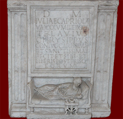 IVLIAE CAPRIOLAE V[ixit] A[nnis] XXXV M[ensibus] III D[iebus] XXV T[itus] FLAVIVS CHRYSIPPVS CONIVG[i] CARISSIMAE ET SANCTISSIMAE FECIT ET SIBI ET LIBERIS POSTERISQ[ue] EORVM.