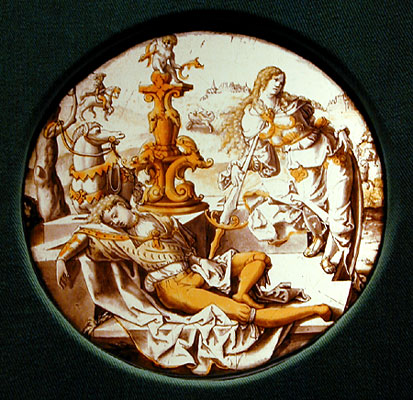 Thisbe kills herself beside body of Pyramus, stained glass roundel by Jan Gossart, 1478-1552
