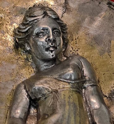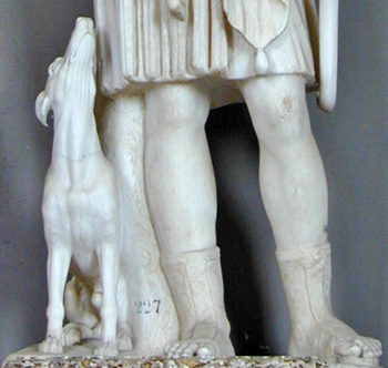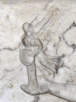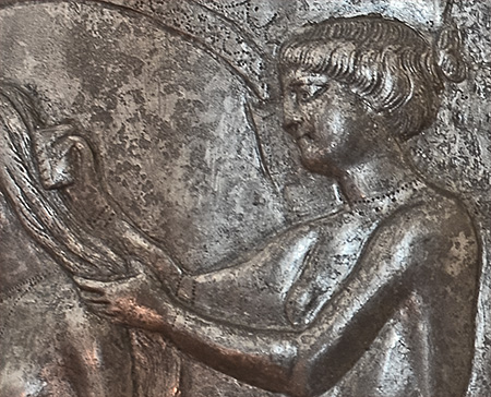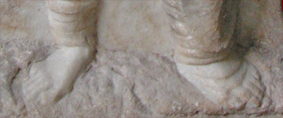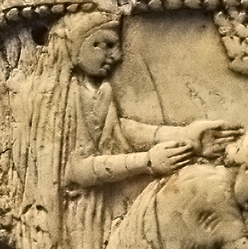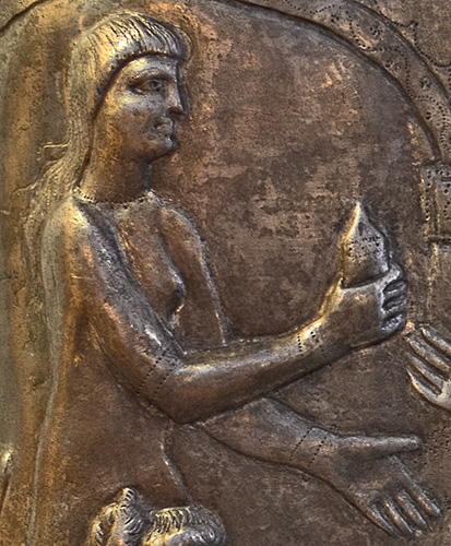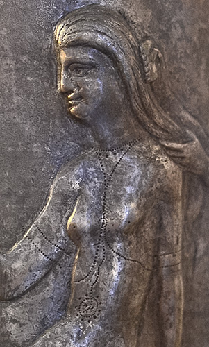 lifts her left arm backwards to grasp this attendant (though the artist has carved the arm in an unnatural