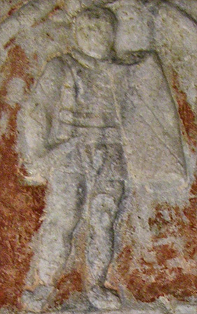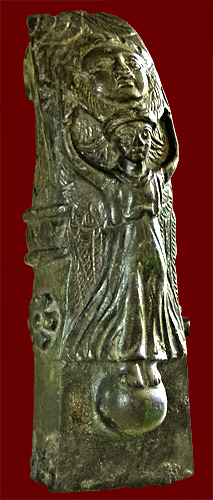 On the south side of the pillar is depicted the goddess Venus, wearing a radiate diadem with a red mantle draped over her shoulders but revealing her unclothed body.