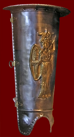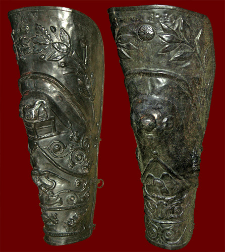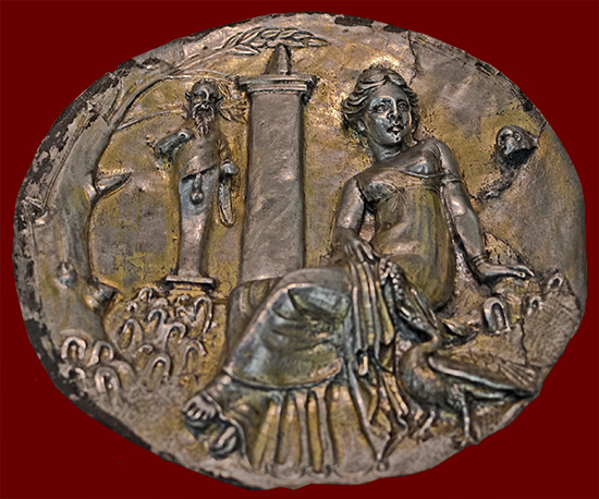 the goddess Roma seated on a pile of arms, reminiscent of the Roman panel on the Ara Pacis. Here she holds a pillar on which a
