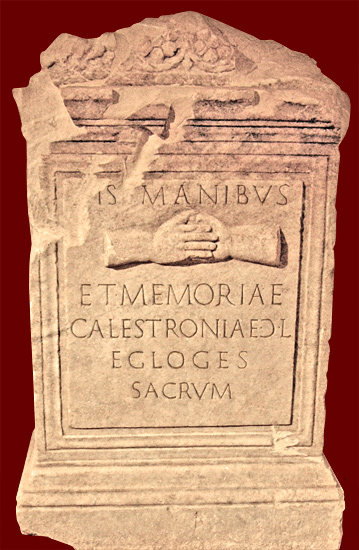 This marble funerary altar was found recently on the via del Casale Rocchi, Pietralata, in the Tiburtina district of Rome. The altar commemorates the freedwoman Calestronia Egloge (Greek for "chosen, selected"); the reversed C indicates that she was freed by a woman, presumably also named Calestronia. The relief depicts two right hands clasped in the dextrarum iunctio symbolic of marriage, though no husband is mentioned.