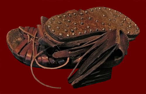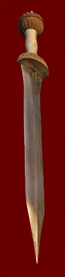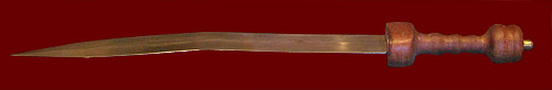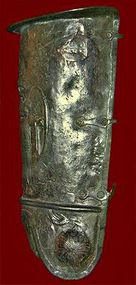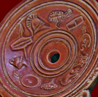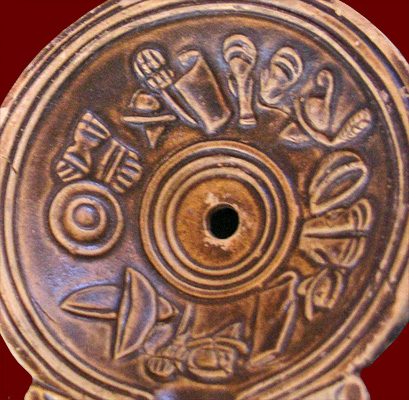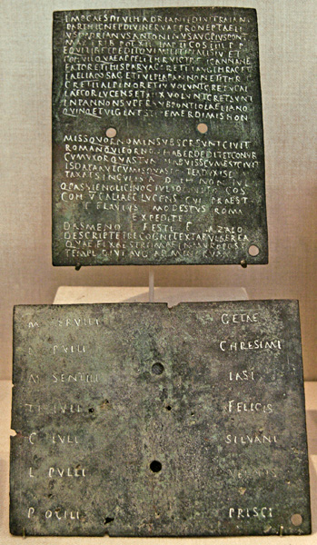 spatula and a wax tablet with 4 leaves; the small projecting bosses prevented the leaves from touching (and thus smearing the writing) when the tablet was closed, and the large spatula was used to erase whole sections of text. In the center are a