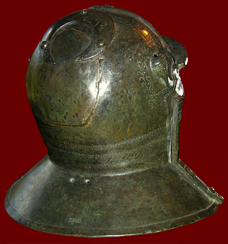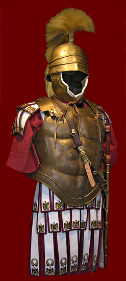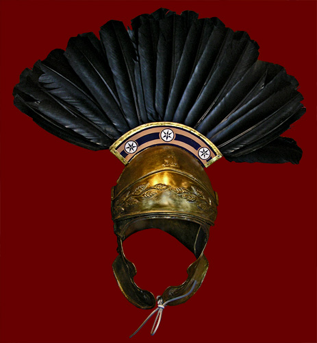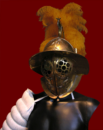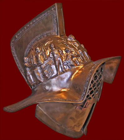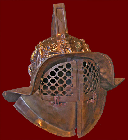 while another puts his head in the god's helmet.