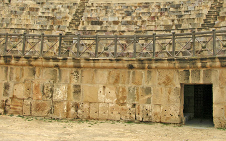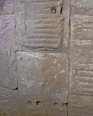 The stone walls in the underground concentric corridor of this amphitheater had numerous holes cut for ease in fastening