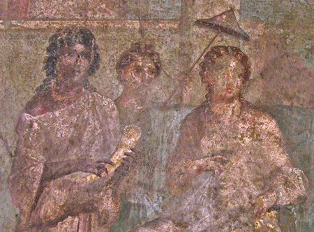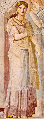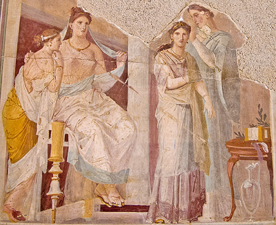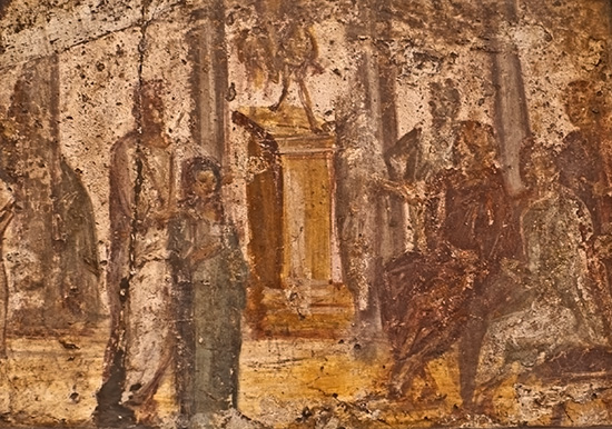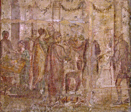 This is one of a series of scenes from everyday life in the forum painted in a frieze on the upper section of the atrium walls. It depicts a man presenting a young girl, presumably his daughter, to two seated magistrates in the forum.