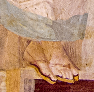 hands toward the mother. Two details suggest that this scene from daily life is intended to represent a