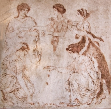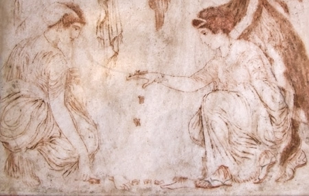 at the left of the relief may be one of the Fates warning Althaea that her son would die when a log in the