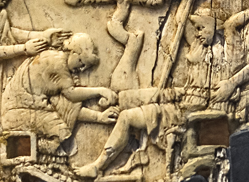 side of the relief portrays three men lifting the body of a fallen companion, so this scene may represent