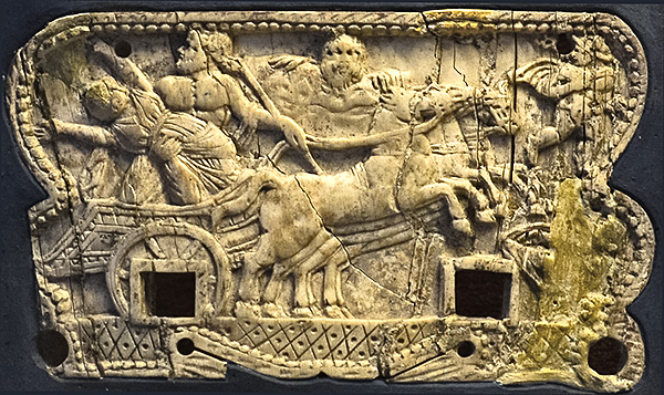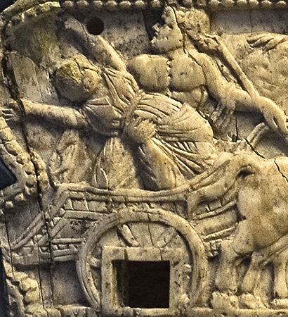 Hades/Pluto carries off a swooning Persephone/Proserpina in a chariot. On the other side of this piece was a relief showing Demeter/Ceres, Artemis/Diana, and Athena/Minerva seeking Demeter's lost daughter.