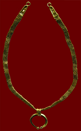 The necklace is plaited. The pendant suggests a crescent pendant (lunula), often worn by by girls as a protective amulet.