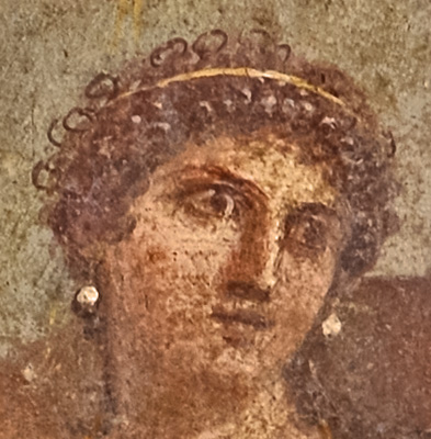 crosses at her breasts and drapes around her torso; a gold band rests on her curly hair and she wears pearl earrings