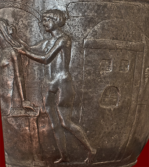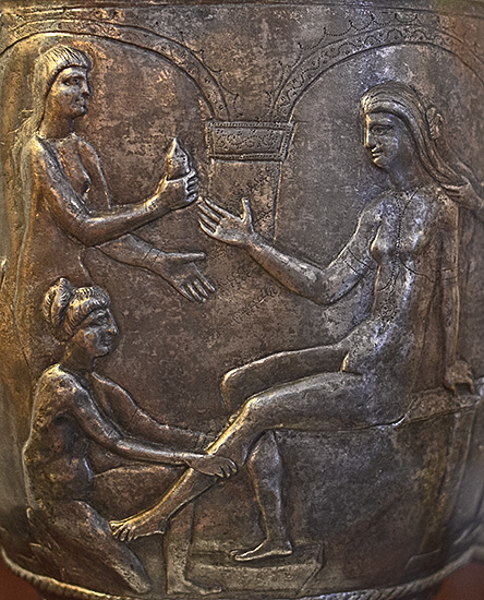 The engraved scene sugggests that this situla was designed to be used in a woman's toilette. The