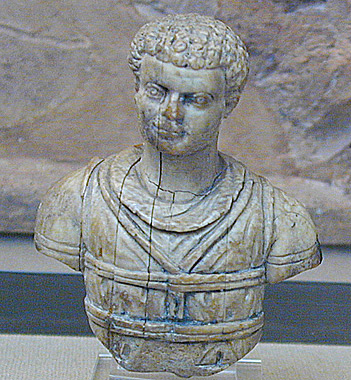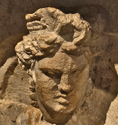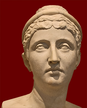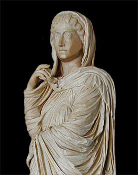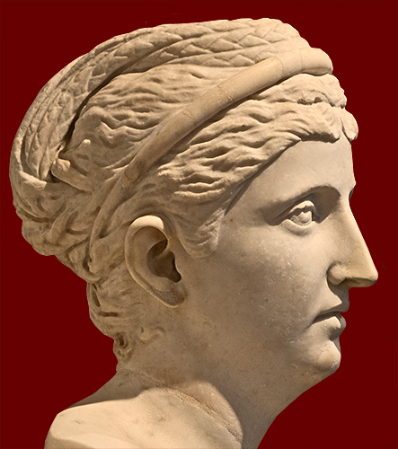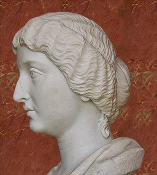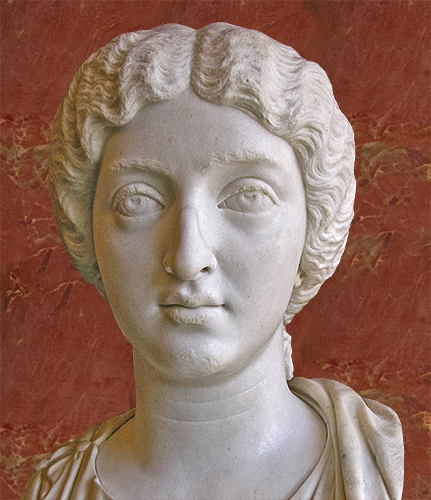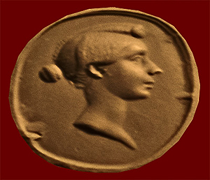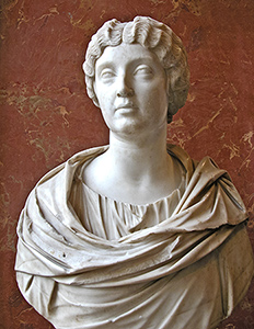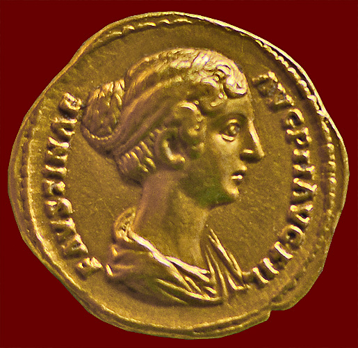 (smaller version) shows Faustina's elaborate hairstyle, parted in the middle and combed back into braids that are coiled around the top of her head. She wears a decorative band around her hair.