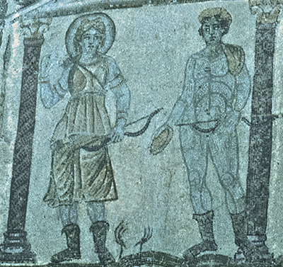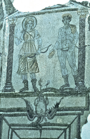 Dura-Europos was a Hellenistic, later Parthian, city on the bank of the Euphrates river in what is now Syria. The city had close ties with Palmyra and was captured by the Romans in 165 CE. This wall painting, from the north wall of the pronaos of the Temple of the Palmyrene Gods, was comissioned by the Roman tribune, Julius Terentius, who is named in Latin. The painting mingles Greek, Roman, and Palmyrene elements; in the lower left corner are the city goddesses (Tychai) of Dura and Palmyra, and above them are three statues wearing Roman cuirasses and Palmyrene helmets. Terentius stands in front of his soldiers making an offering at a