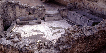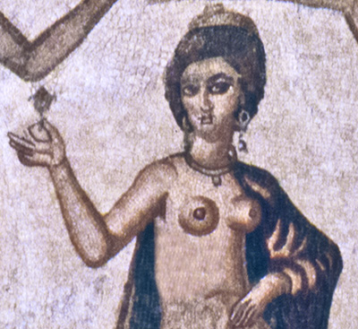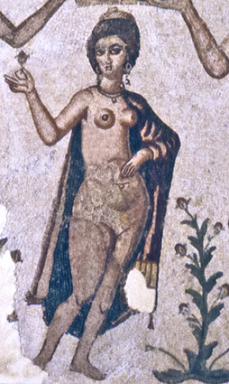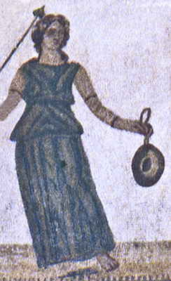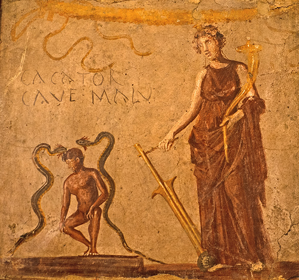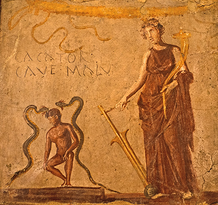 The goddess Fortuna, holding a cornucopia and rudder, looks down upon a naked man crouching between two bearded serpents; the words CACATOR CAVE MALV[m] ("Shitter, beware of evil!") are painted above the man. The museum tag identifies the goddess as Isis-Fortuna-Demeter and the man as Harpocrates, but most interpreters think that the man is defecating and the goddess and serpents are apotropaic symbols.