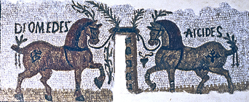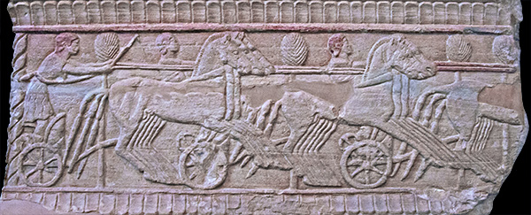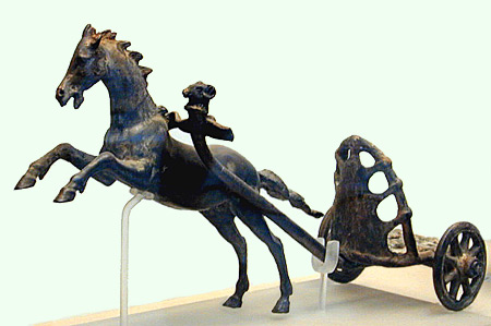 long ribbon-like strip crossed under her breasts and fastened to her belt with a rosette brooch. The urn depicts the death of King Oinomaos, father of Hippodamaia, in his chariot race against Pelops for the hand of his daughter. The