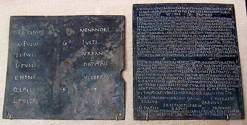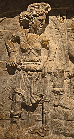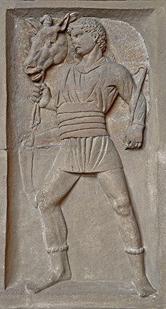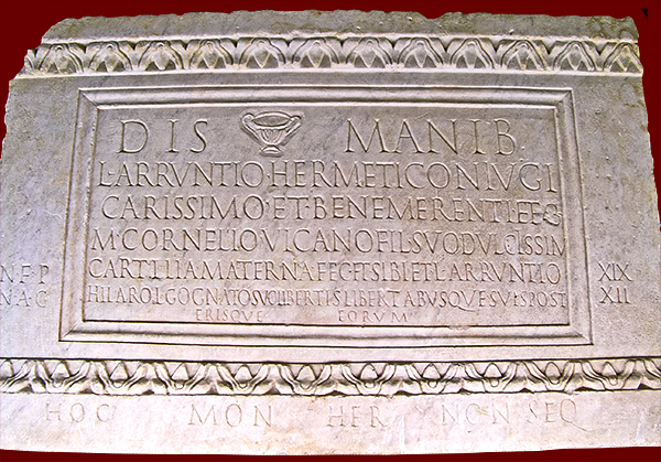 According to the inscription, the freedwoman Materna dedicated this plaque to her husband, Lucius Arruntius Hermes, her son, Marcus Cornelius Vicanus, and her relative Lucius Arruntius Hilarus.