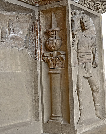 have broken off; one advances from the left brandishing a torch, while the other bends over his drooping head. On either side of the chest stands