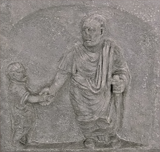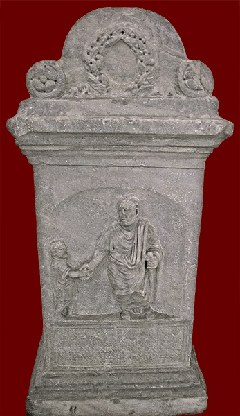 he is shown togate, holding a scroll in his left hand and clasping the hand of a small boy with his right. There is a patera carved on the right side of the altar and an urceus on the left.