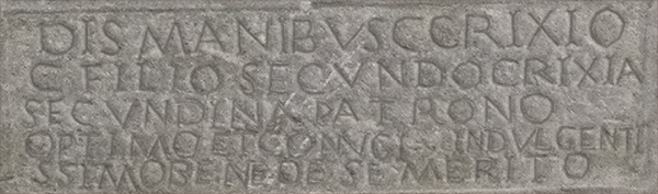Found in a necropolis on the Via Flaminia in Rome, this altar was dedicated by the freedwoman Crixia Secundina to her freeborn patron and husband, Crixius Secundus. In the