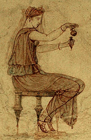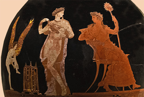 In the central scene, a wreathed female in a diaphanous dress, holding a wreath and lifting a corner of her veil with her mouth, looks toward Dionysus, seated and wearing a diadem. She is identified as Pompe, the personification of processions, and the gilt basket at her feet is the type used in religious processions to hold ritual implements. Behind her, Eros is shown tying his sandal. The vase probably refers to the Anthesteria, a spring festival in honor of Dionysus in which the the god supposedly celebrated a sacred marriage with the wife of the archon basileus in Athens.