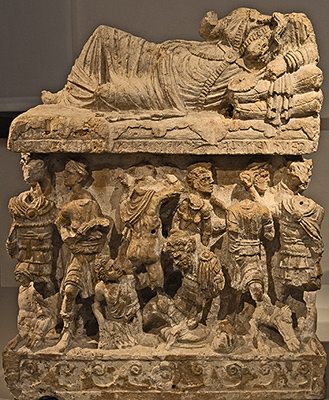 Etruscan cinerery urn with lid depicting a reclining woman, travertine limestone, from Perugia, c. 150 CE;