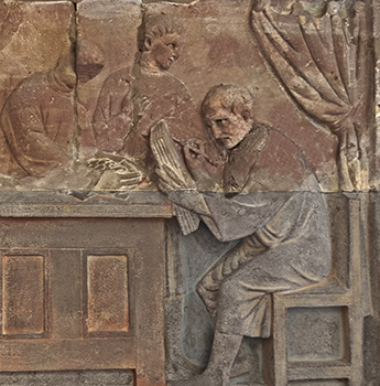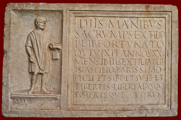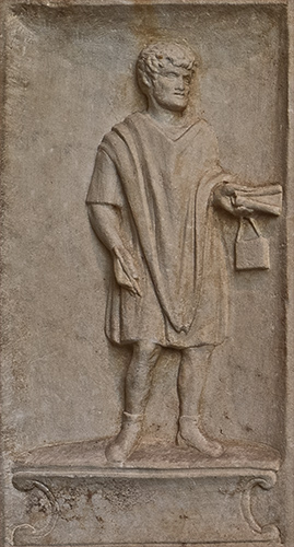 freedman son, who is shown carrying a reed pen, scroll, and wax tablets.