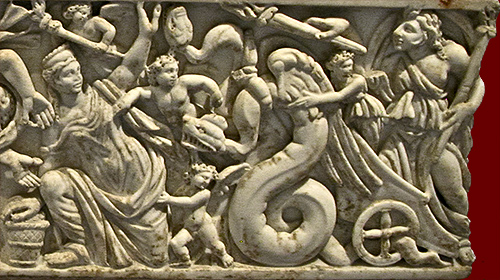 This sarcophagus uses the myth of the rape of Proserpina to emphasize the violent journey of death. On the left stand Minerva and Mercury, while a female figure with a cornucopia personifying the earth lies below the hooves of Pluto's galloping horses. In the