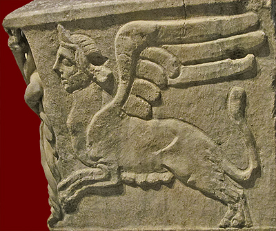 winged sphinx appears on either side of the sarcophagus.