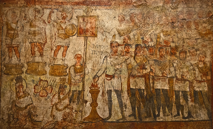 wall painting of Julius Terentius performing a sacrifice, Roman, from Dura-Europos, c. 239 CE;