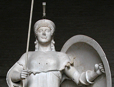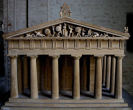 This view shows a reconstruction of the East Pediment of the late archaic Doric temple, representing the earliest (non-Homeric) Trojan War.