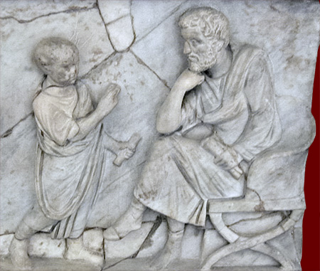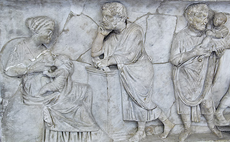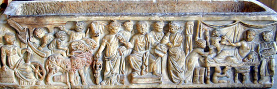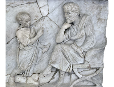 This biographical sacrophagus, dedicated to an aristocratic boy by his parents, depicts the stages in a young boy's life. On the left, the