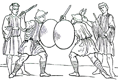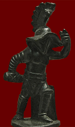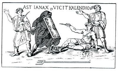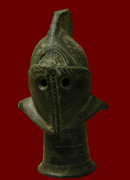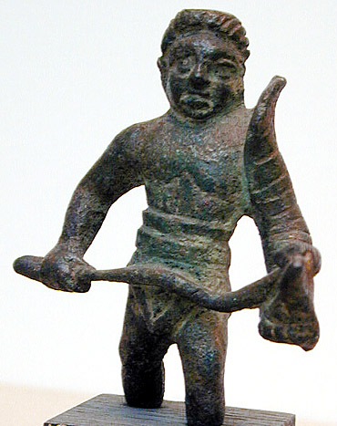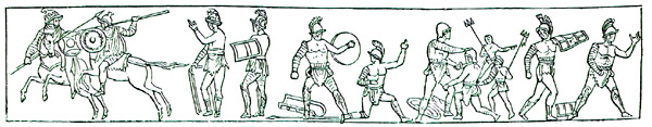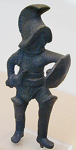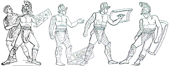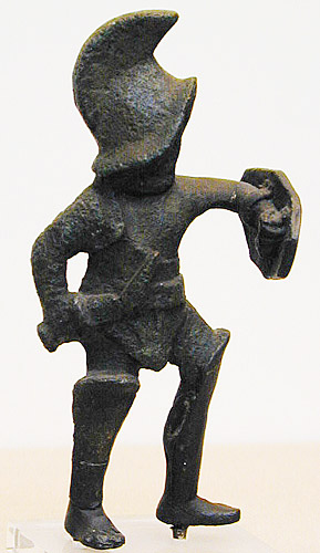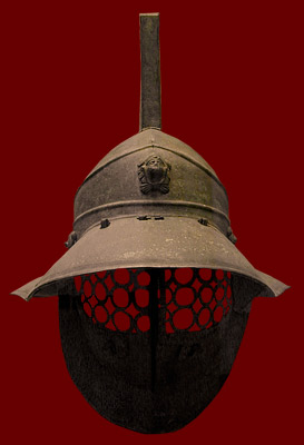 gladiator: greaves, small shield, helmet with horns and crest; Roman,
