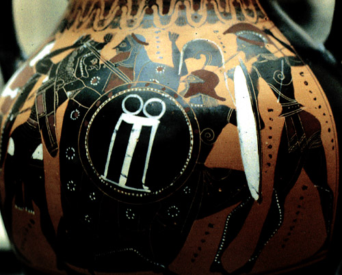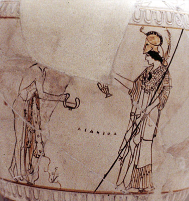 Athena with spear and shield surrounded by warriors; Greek, c.500-480 BCE
