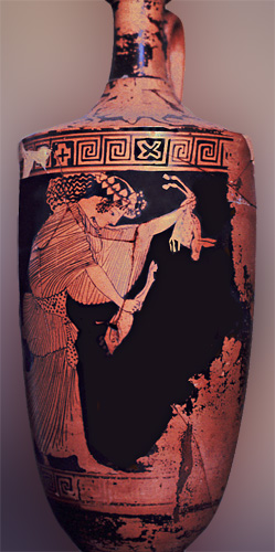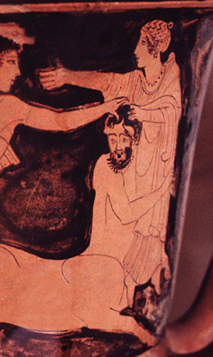 depicting Electra (other side shows Clytemnestra with axe); Attic, c. 490 BCE