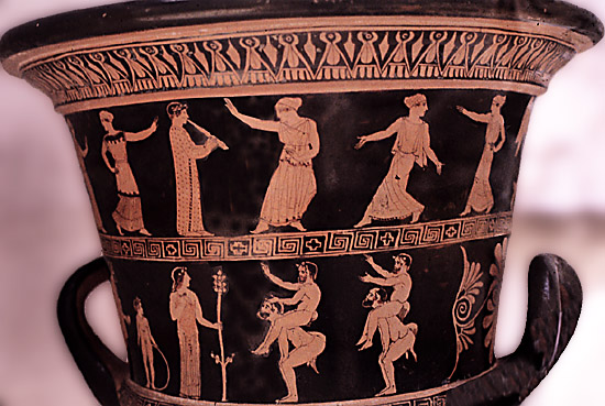 with two thyrsi ecstatically dancing between other maenads and satyrs; Greek,