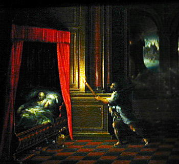 personification of Sleep, holding poppies, pours a sleep potion over him. Behind Selene a