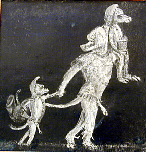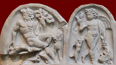 A reclining maenad nurses a baby leopard while another maenad with flowing veil holds a tambourine. On the left a naked satyr grasps the leopard's tail. Below are Dionysiac symbols--castanets, a wine cup, and a tambourine.