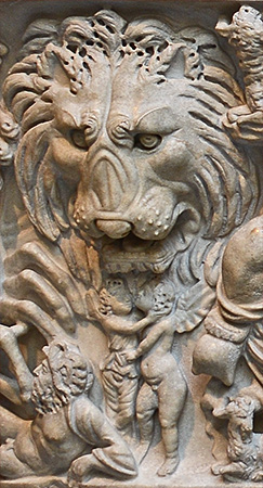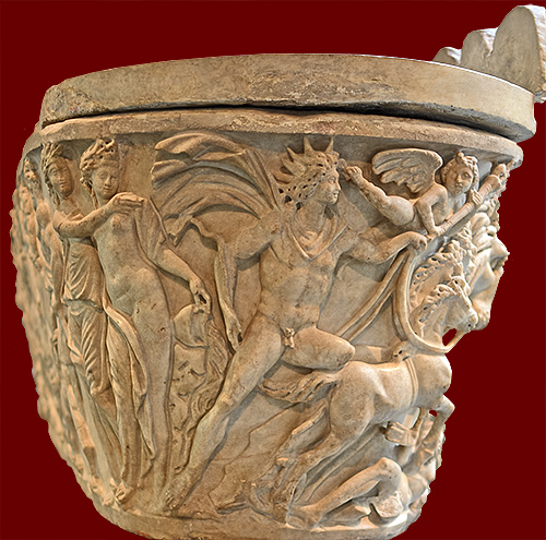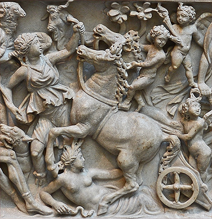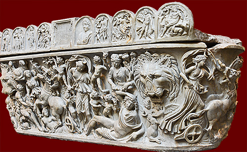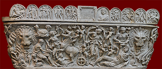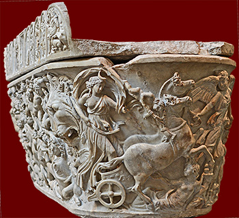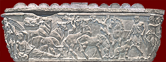 The sarcophagus is beautifully carved in high relief, depicting the myth of
