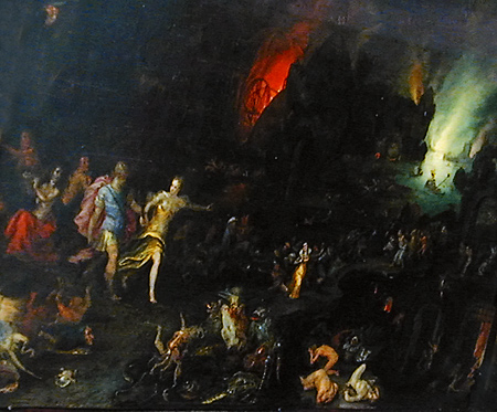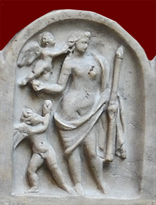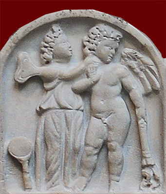 and points his torch downward, perhaps reflecting the god's anger at Psyche when she doubts his immortality in the story as told in Apuleius' Metamorphoses. The