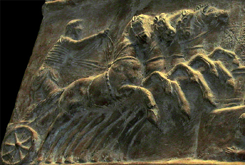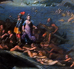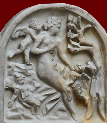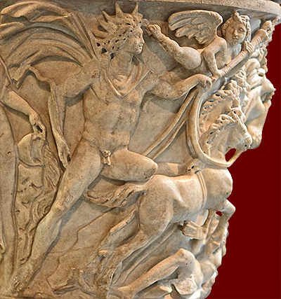 sun god Helios drives his chariot over a reclining male figure representing the ocean, with a rising motion indicated by the Cupid leading the chariot with upward-pointing torch. On the right side